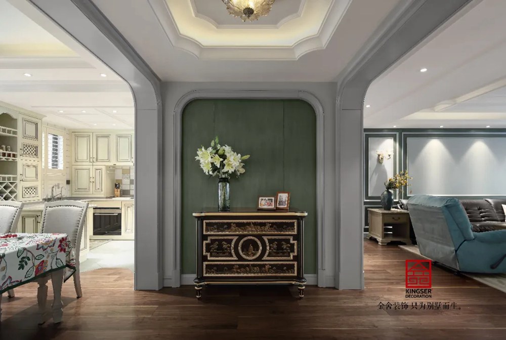 客廳綠色的點綴在靜謐的空間里恰到好處,完美之處在于步入入戶門的這一刻,映入眼簾的皆是經典簡約美式元素,圓潤的造型、浪漫的素色基調、溫暖的木質材料、極具講究的家具和燈飾。這種享受就好像是在回味經典電影中的浪漫情節(jié),灰黃色的記憶,羅曼蒂克的生活。