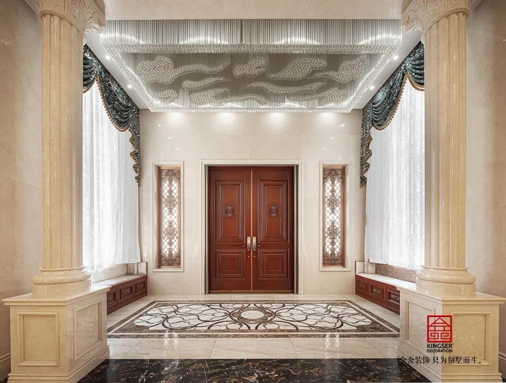 此案例為石家莊金舍裝飾-無(wú)極御瓏華府2400平米別墅歐式風(fēng)格裝修實(shí)景。御瓏華府“中西合璧”這是一套集“土建+硬裝+軟裝+庭院”一體的全案設(shè)計(jì),占地東西70米,南北50米,整個(gè)結(jié)構(gòu)坐落于小區(qū)的核心位置,打開家門,先是私有的庭院生活,再而迎面就是小區(qū)的綠化水系,視野開闊,一覽全景。方案設(shè)計(jì)為“中西合璧”風(fēng)。浪漫的歐式古典風(fēng)融入東方設(shè)計(jì)元素,嶄新的文化底蘊(yùn)得以傳承,既有歐式的富貴典雅又有中式的文化底蘊(yùn),二者巧妙應(yīng)用,提升整個(gè)空間氣質(zhì)。