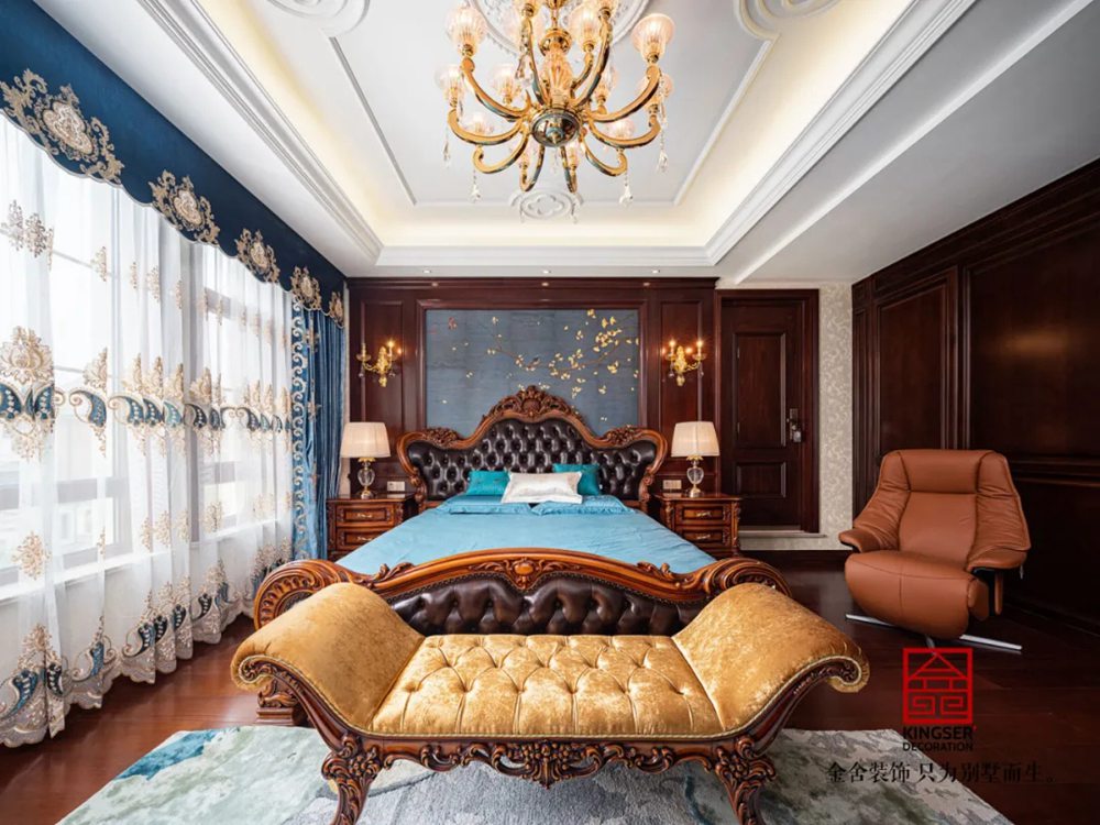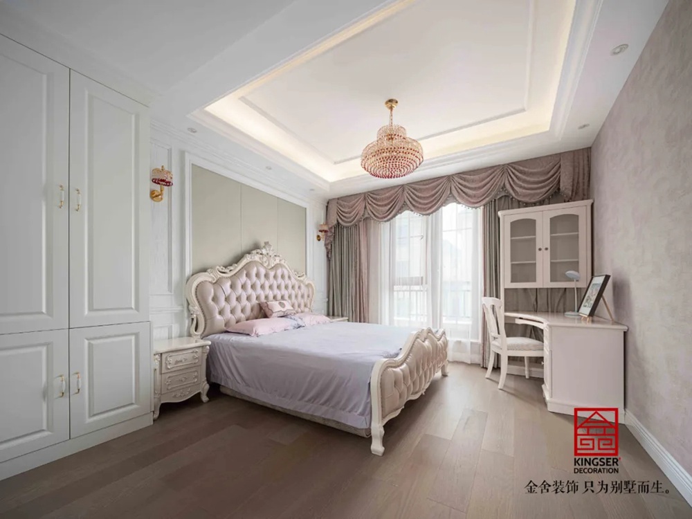 質(zhì)感極佳的壁紙設(shè)計和富有層次的布局設(shè)計,凸顯出整體空間的美觀和優(yōu)雅。銅制的金色水晶吊燈,不但增添了空間的雅致感,更是瞬間豐盈了整體的視覺效果。
