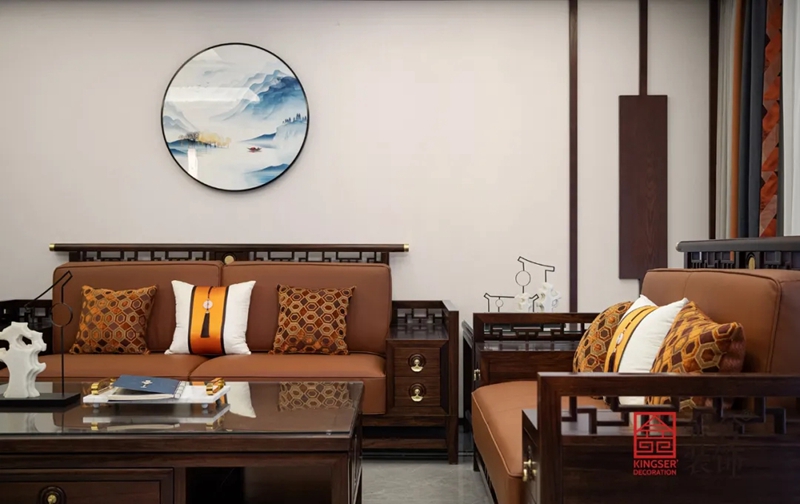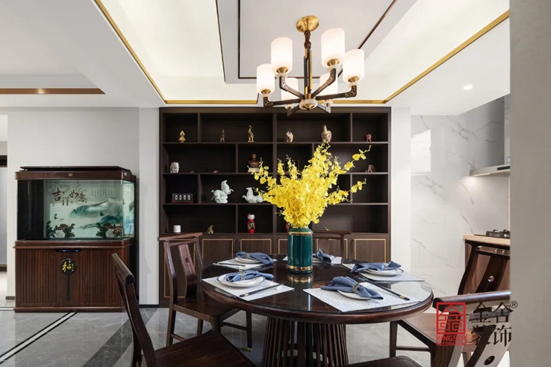 詩如明月,飛波揚彩;明月如詩,玉潤冰清??蛷d沙發(fā)背景墻的圓形裝飾就如同一輪皎皎于天際的明月,暈染了整個空間,唯美之感頓生。電視墻對稱的花格設計突出了傳統(tǒng)中式的風范,古典精致的空間不失通透靈動的氣質,山水感十足大理石與造型古樸的壁燈結合,穩(wěn)重大氣。色彩濃厚的軟裝配飾在這魅力的客廳里,隨性地揮灑出沉穩(wěn)的古樸之美。