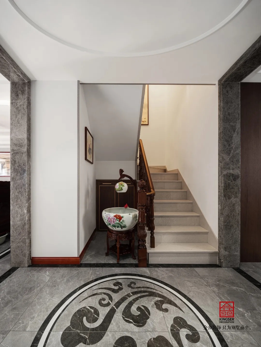此案例為石家莊金舍裝飾-大者別墅300平米新中式風(fēng)格裝修實(shí)景??蛷d空間運(yùn)用木質(zhì)的材質(zhì)組合搭配,帶來(lái)視線的清涼質(zhì)感,同時(shí)中式的端莊典雅又慢慢在空間散發(fā)開(kāi)來(lái)。古銅色的吊燈精致而特別,立體感十足,柔和了空間氛圍。中式的古木家具沉靜而典雅,細(xì)致的雕花設(shè)計(jì)凸顯主人的不凡品位。而地板的大理石紋理又很合適宜地給空間帶來(lái)了時(shí)尚的現(xiàn)代氣息,非常愜意。