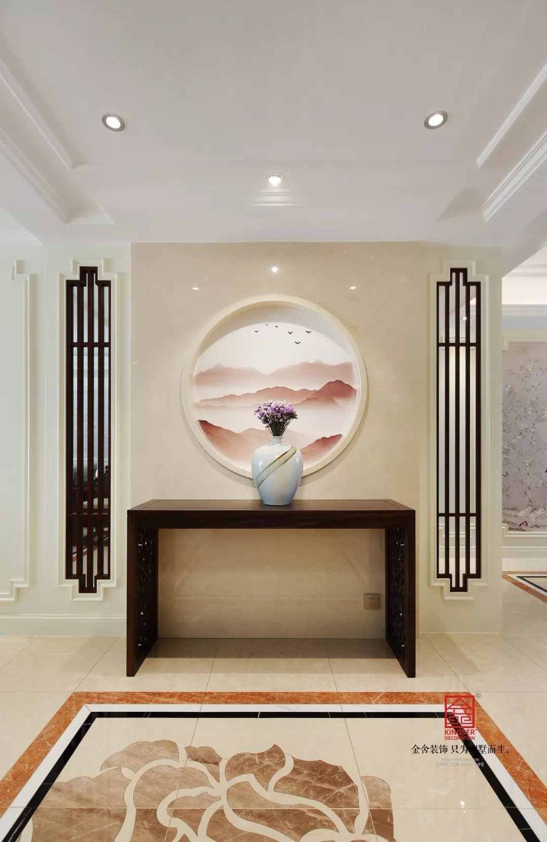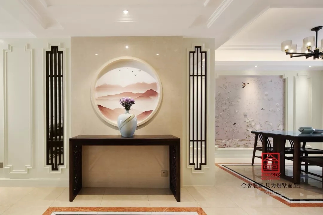 玄關走廊淡素色墻面,質感簡單又沉穩(wěn)、原始又兼具現(xiàn)代感,圓形的窗棱感覺與水墨風的壁布融為一體,即凸顯出中式風的特色,又形成色調上濃淡界限,增加空間層次。兩邊的木質窗棱簡潔樸質,頂面的射燈映背景墻,為樸厚空間注入柔美與雅韻。