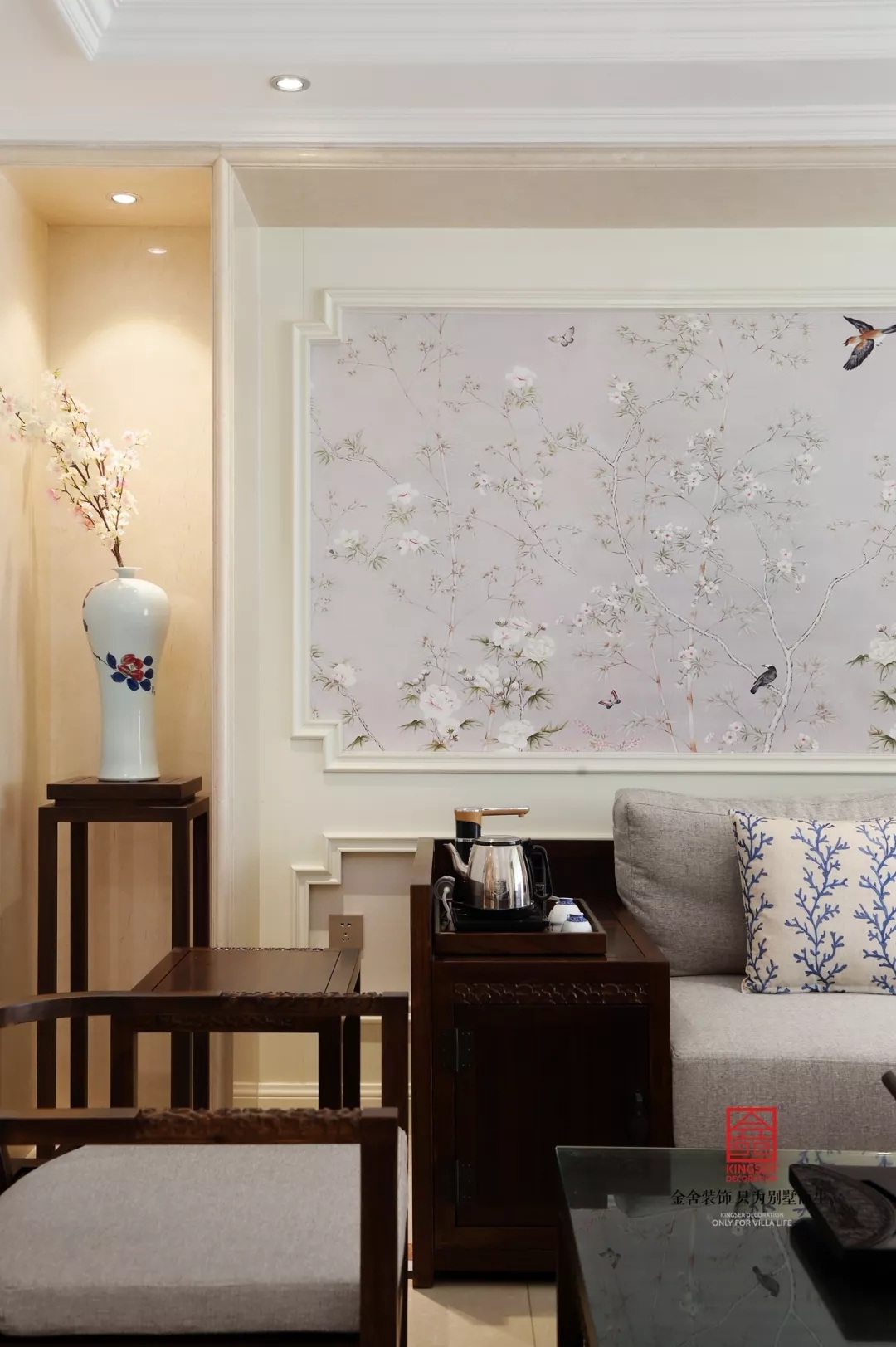 空間里把中西方兩種風格交織融合,碰撞出完美的繪卷,讓你有一種在時光下舒緩閑逸;閑暇時泡一壺清茶,執(zhí)一縷墨香,聆聽陌上花開的聲音,溫暖了身心的疲憊。
