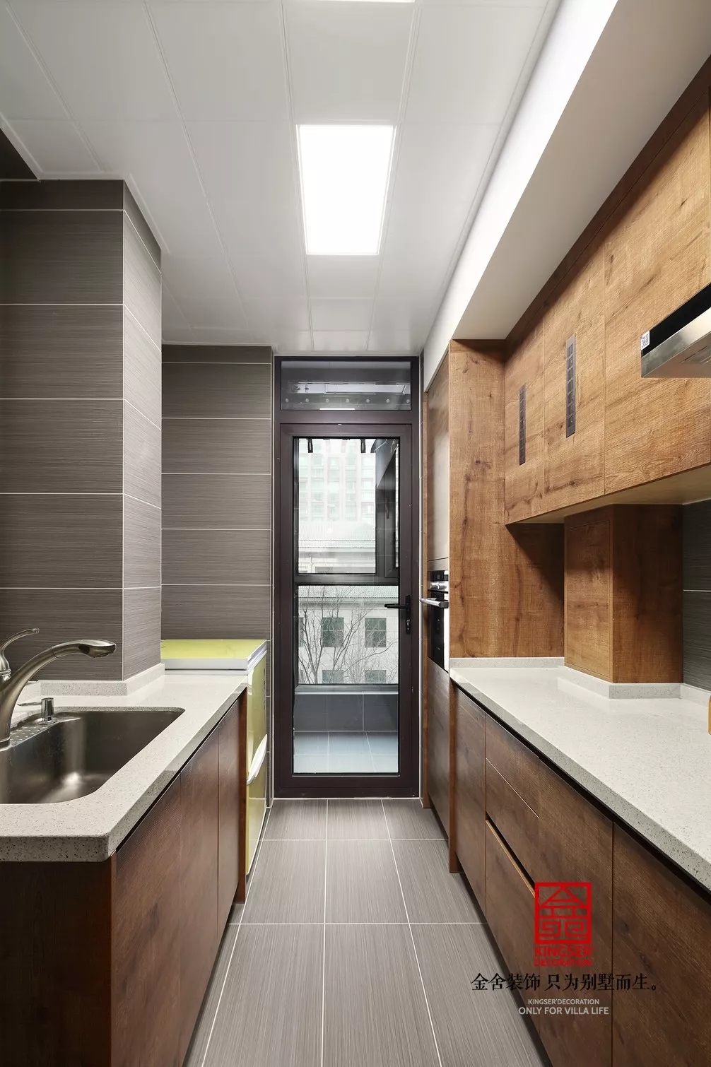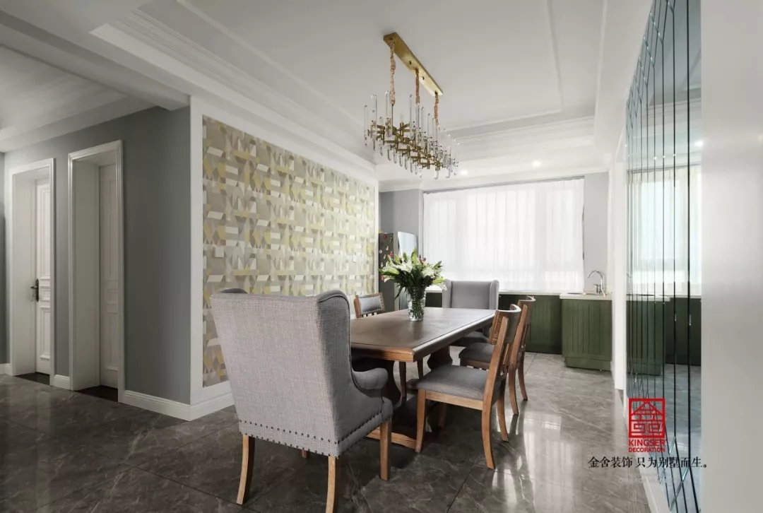 精致的裝飾細節(jié)表現(xiàn)了設計師的細膩,從大空間到小細節(jié),都在做整體呼應,金屬與木質(zhì)的配合,表現(xiàn)了對品質(zhì)生活的向往,大面積的灰體現(xiàn)出來的高級感,簡單流暢的線條,讓整個空間既舒適又時尚。餐廳內(nèi)造型充滿現(xiàn)代感的金屬吊燈,讓整個空間更加柔美,形成一個溫馨的用餐環(huán)境。餐廳背景墻的銀色鏡子更是增加了就餐時的趣味。