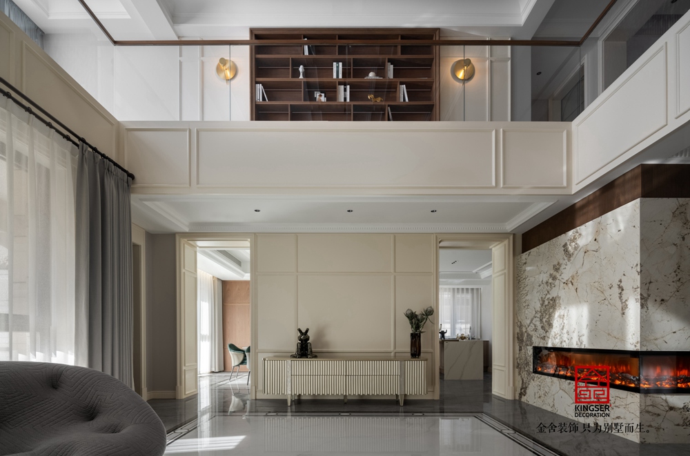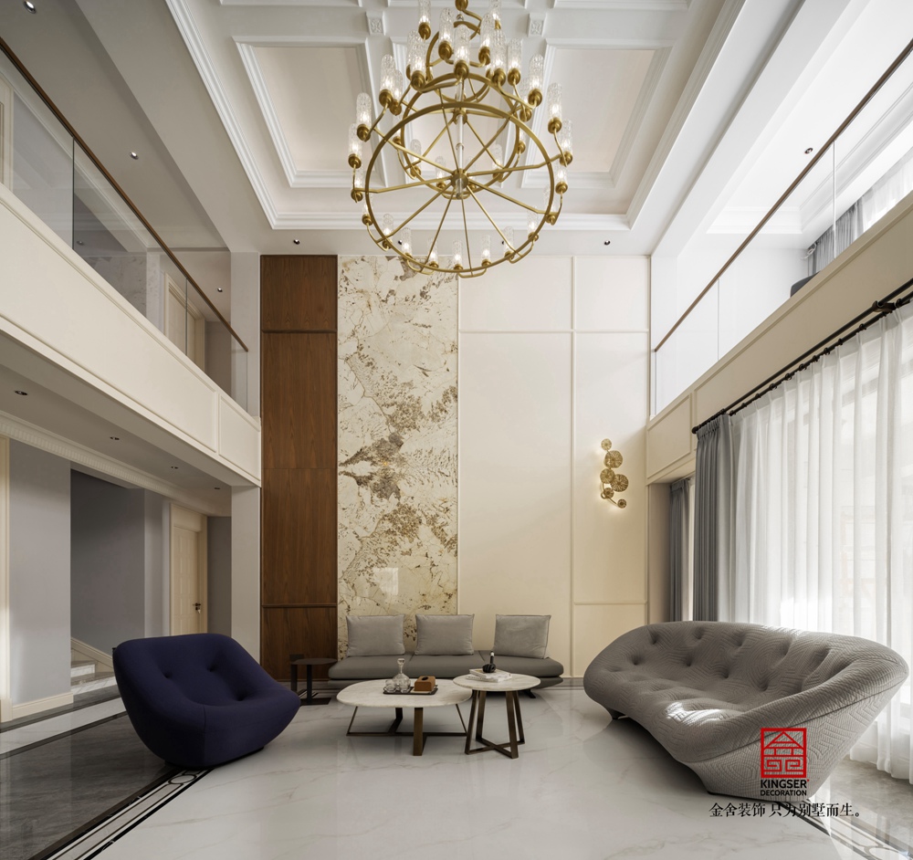 別墅的客廳,無疑是整棟建筑中的璀璨明珠。在挑高六米的宏偉空間中,我們巧妙地布置了一個簡約風格的轉角壁爐區(qū),與素色沙發(fā)相映成趣,營造出一種既現(xiàn)代又舒適的氛圍。