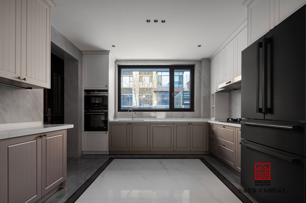 巧妙地融合了餐廳與廚房的空間,創(chuàng)造了一個開放而又不失獨立性的餐廚一體化區(qū)域。這一設計理念旨在讓烹飪與用餐的體驗更加流暢,同時也增強了家人與朋友之間的互動。餐廚空間的中心位置,我們精心打造了一個巖板中島臺。中島臺不僅作為廚房的操作臺,還充當了餐廳與廚房之間的自然分隔,既保證了兩個空間的獨立性,又確保了視線的通透與流動。