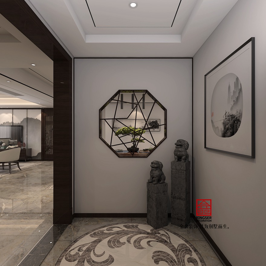 整體的色調(diào)以黑白灰為主,根據(jù)需求從新劃分功能空間,并參考了中式園林里面的造景手法,達(dá)到室內(nèi)空間的“一步一景”。入戶(hù)玄關(guān)位置把原有的墻面做了一些拆改,透過(guò)中式八角窗,映入眼簾是茶室桌面上的盆景,兩個(gè)石獅子也體現(xiàn)了充分的中式元素。錯(cuò)落的竹節(jié)燈,不僅起到了照明的作用,也有著著節(jié)節(jié)高升的寓意。家具造型簡(jiǎn)約,采用棉麻、·胡桃木、金屬等材質(zhì)打造空間內(nèi)的氣質(zhì)元素,與香道飾品完美融合,收放自如的詮釋了東方的精髓,讓人倍感上流社會(huì)的優(yōu)雅與品味。