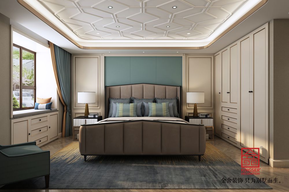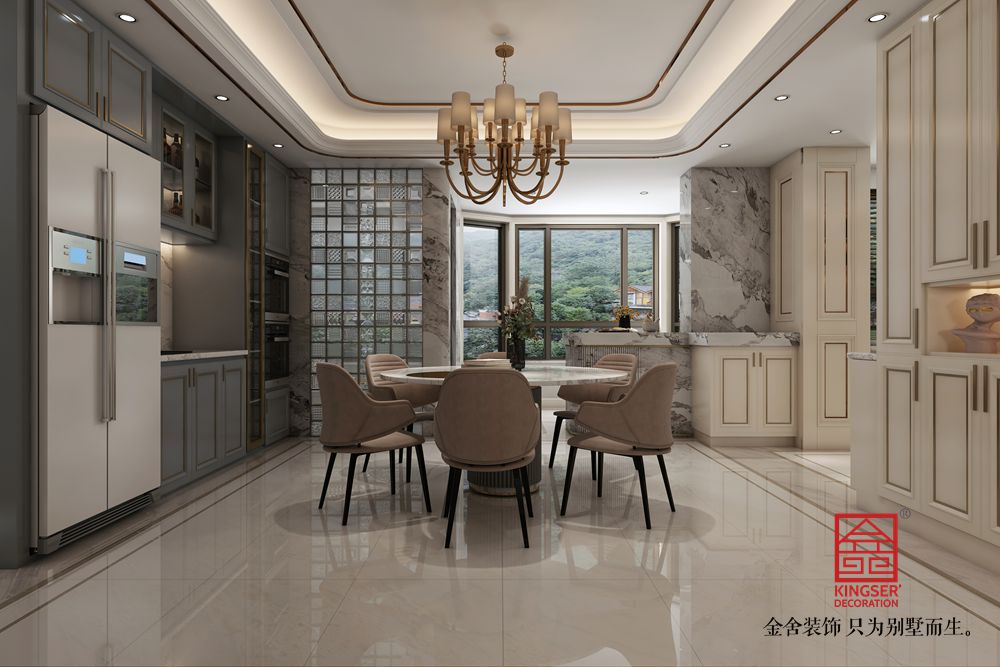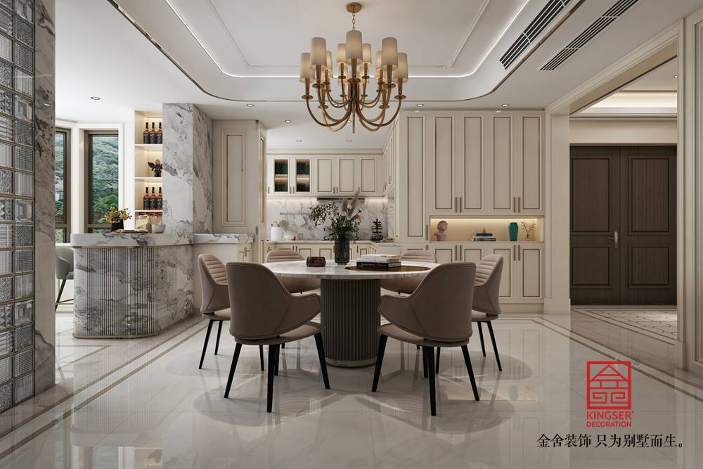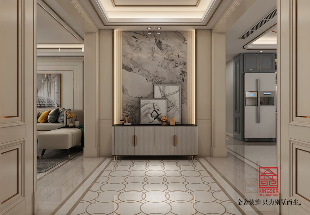 設(shè)計(jì)說明:此案例為石家莊金舍裝飾-榮盛華府205平米美式風(fēng)格裝修效果圖。美式風(fēng)格的客廳面積很大,看上去就很氣派,加上非常有質(zhì)感的家具,盡顯奢華意境,美式風(fēng)格的裝修很注重各種線條的裝飾,吊頂和墻面上都有美觀的線條,水晶吊燈更是增加了整個(gè)客廳的亮度,同時(shí)也提升了檔次,墻面上的掛畫非常有藝術(shù)氣息,體現(xiàn)了主人的文化底蘊(yùn),在這樣的客廳里家人一起休閑娛樂或是招待客人都是非常好的。