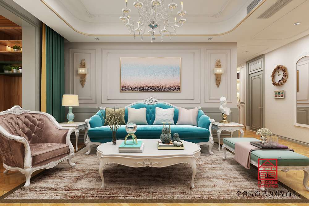 設(shè)計說明:此案例為石家莊金舍裝飾-東南智匯城126平米法式輕奢風格裝修效果圖。藍色系具有立體感的沙發(fā)顏色,使墻面很顯層次感;多彩的地毯、靈動設(shè)計的臺燈、不拘一格的掛畫,營造出一幅自由、溫馨、浪漫的氛圍;而客廳旁的落地窗給足了這間空間明亮的自然采光,用餐區(qū)域餐桌上方的水晶吊燈與客廳中的精致吊燈遙相呼應,讓整個空間之中都映射出一種浪漫氛圍,法式風格如同法國這個國家一樣,浪漫迷人,仿佛普羅旺斯的陽光,灑滿你的家。藍色調(diào)營造浪漫時尚法式風情,尋求心靈的自然回歸感;將法式傳統(tǒng)的三顏色與當季流行色融合,不失法式的貴氣和浪漫