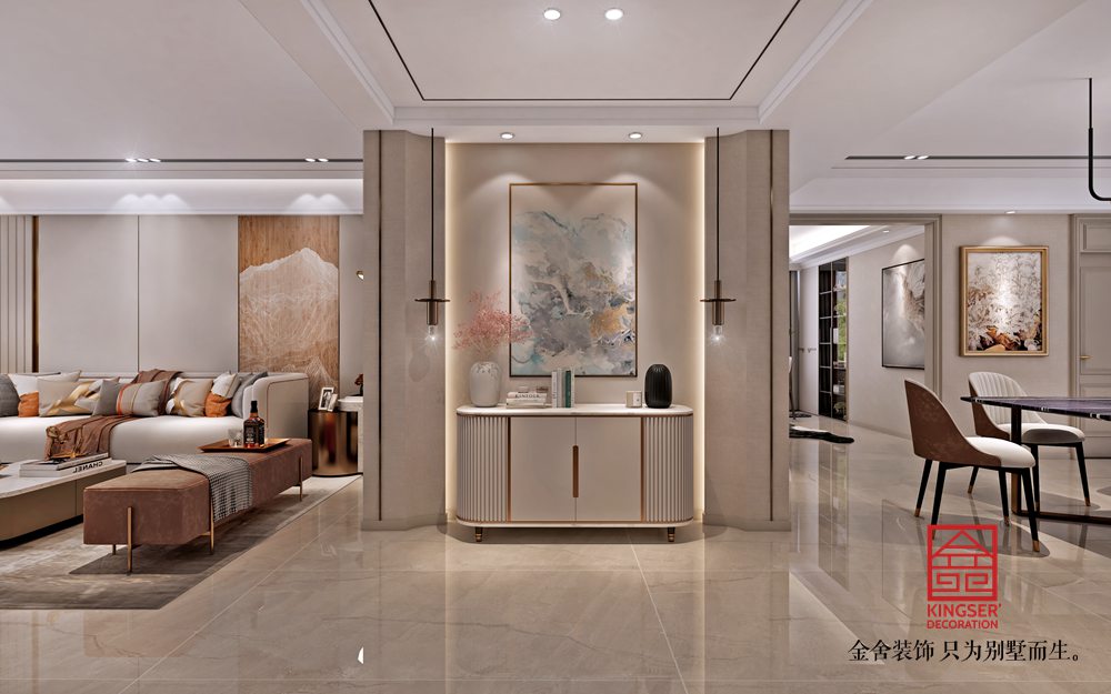 此案例為石家莊金舍裝飾-榮盛華府213平米輕奢風格裝修效果圖。輕奢是一種格調(diào)風尚,是一種極減的風格不是鋪排和堆積,是用極少的物質(zhì)和人力,做出高,大,上的規(guī)格,給人們的視覺上帶來清新,簡潔,高雅,極貴的感受。輕奢是設(shè)計的一種路線和風格,以簡勝繁,以少勝多,達到出奇制勝的效果。