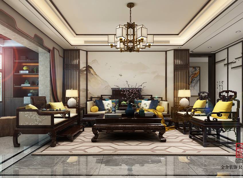 石家莊金舍裝飾-榮盛華府185平米新中式風格裝修效果圖。定位為新中式禪意風格,本方案的設計哲學是給人一種靜謐、平和、舒緩的感覺,新中式設計追求的是一種清新高雅的格調(diào),注重文化積淀,講究雅致意境。以簡樸、舒適、隨意的特點給人很強的吸引力,搭配著新中式的紅木家具,為生活營造出一個寧靜、安逸、平和的風格。既繼承了傳統(tǒng)中式風格的固有理念和元素,又有現(xiàn)代設計理念的創(chuàng)新以及現(xiàn)代工藝的運用。當走進禪意新中式設計的房間,仿若走進了另外一種生活狀態(tài)。新中式的圈椅沙發(fā),簡單大方的茶幾。讓人好不愜意。這種表現(xiàn)能夠完整地體現(xiàn)出居住人追求品質(zhì)、典雅生活,視生活為藝術的人生態(tài)度。
