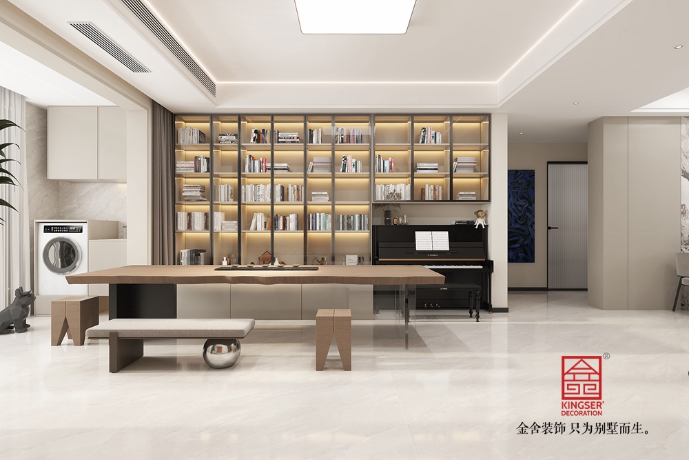 此空間采用去客廳化設(shè)計(jì),打破傳統(tǒng)客廳單一社交功能的局限,打造出集閱讀、藝術(shù)、休閑等多元體驗(yàn)于一體的復(fù)合區(qū)域。 整面玻璃書柜兼具收納與展示功能,暖光加持下,書籍仿若藝術(shù)品,營(yíng)造出靜謐的閱讀氛圍。原木長(zhǎng)桌造型獨(dú)特,成為空間核心,可滿足閱讀、手工等多樣需求,搭配簡(jiǎn)約座椅與長(zhǎng)凳,為互動(dòng)交流提供靈活場(chǎng)景。鋼琴的融入,為空間注入藝術(shù)氣息,讓居者能隨時(shí)沉浸于音樂(lè)世界。
