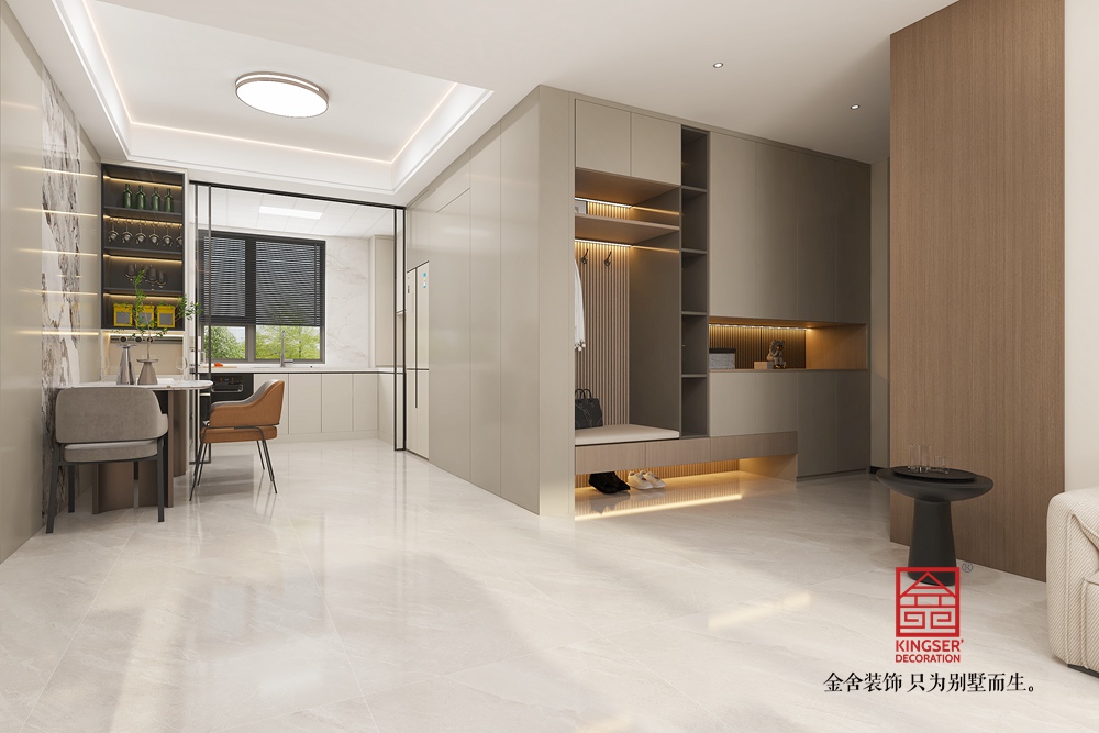 材質(zhì)上,原木的自然質(zhì)感、大理石的光潔以及金屬的精致相互融合,層次豐富。燈光設(shè)計(jì)巧妙,嵌入式燈帶與頂燈營(yíng)造出柔和均勻的光照,凸顯空間通透感。整體設(shè)計(jì)摒棄傳統(tǒng)客廳的刻板,以實(shí)用與美學(xué)兼具的布局,為居者帶來(lái)更具個(gè)性與深度的生活體驗(yàn),詮釋了去客廳化設(shè)計(jì)對(duì)生活方式的創(chuàng)新與升級(jí)。