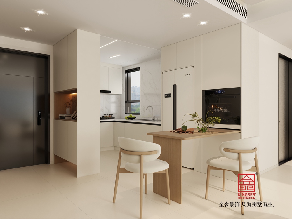 本客廳設(shè)計(jì)聚焦現(xiàn)代輕奢與實(shí)用功能的融合。以簡潔的白色為主調(diào),搭配木質(zhì)元素,營造出溫馨且雅致的氛圍。墻面設(shè)置投影幕布,結(jié)合下方的仿真火焰裝置,打造出兼具觀影與氛圍感營造的核心區(qū)域,滿足休閑娛樂需求。家具選擇上,弧形白色坐凳與造型獨(dú)特的茶幾,為空間注入柔和與精致感。整體布局通透,大窗戶引入充足自然光線,讓空間更顯開闊舒適,是一個(gè)集美觀與實(shí)用為一體的高品質(zhì)起居空間。