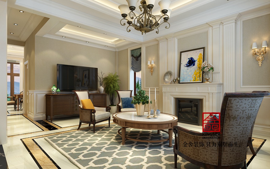 設(shè)計說明:此案例為石家莊金舍裝飾-大者別墅300平米美式風(fēng)格裝修案例。本案采用了簡單明了的淺色調(diào)的清新美式風(fēng)格,整體的色調(diào)采用了淺米黃色的素色壁紙,加之乳白色簡潔造型,精致的銅鑄吊燈,使得整個空間錦上添花,質(zhì)樸而不奢華。搭配亮色布藝和簡潔干練的美式家具,使得整個空間簡潔大方,質(zhì)樸典雅,完美的符合了業(yè)主提出的“簡潔而不簡單”的設(shè)計理念。